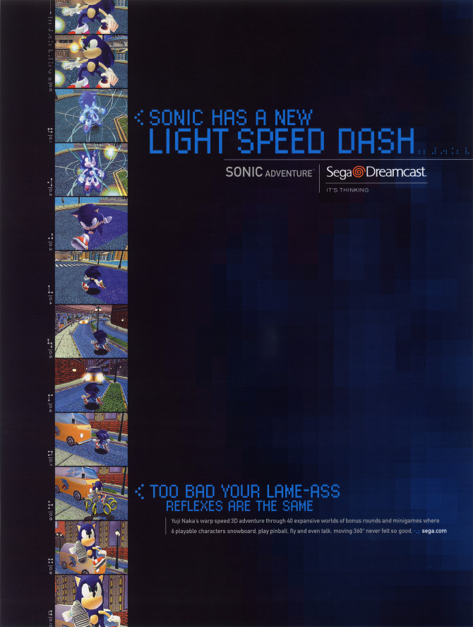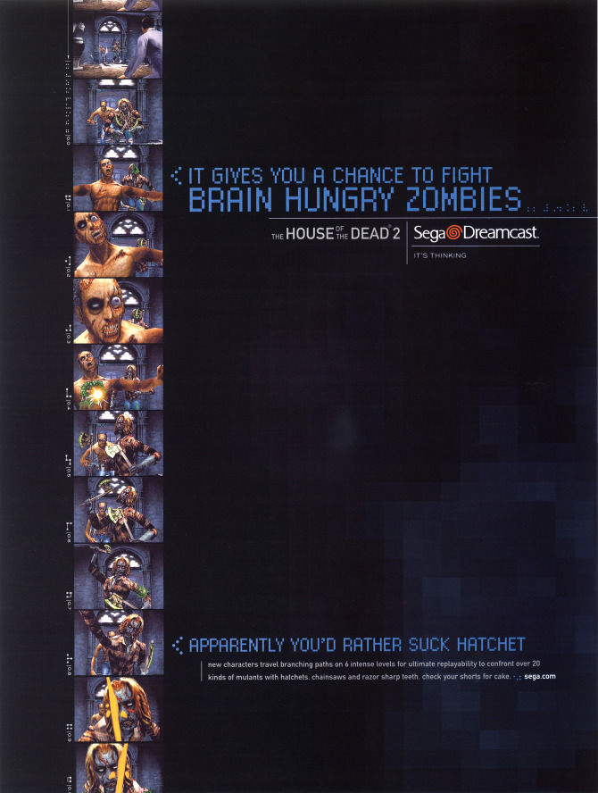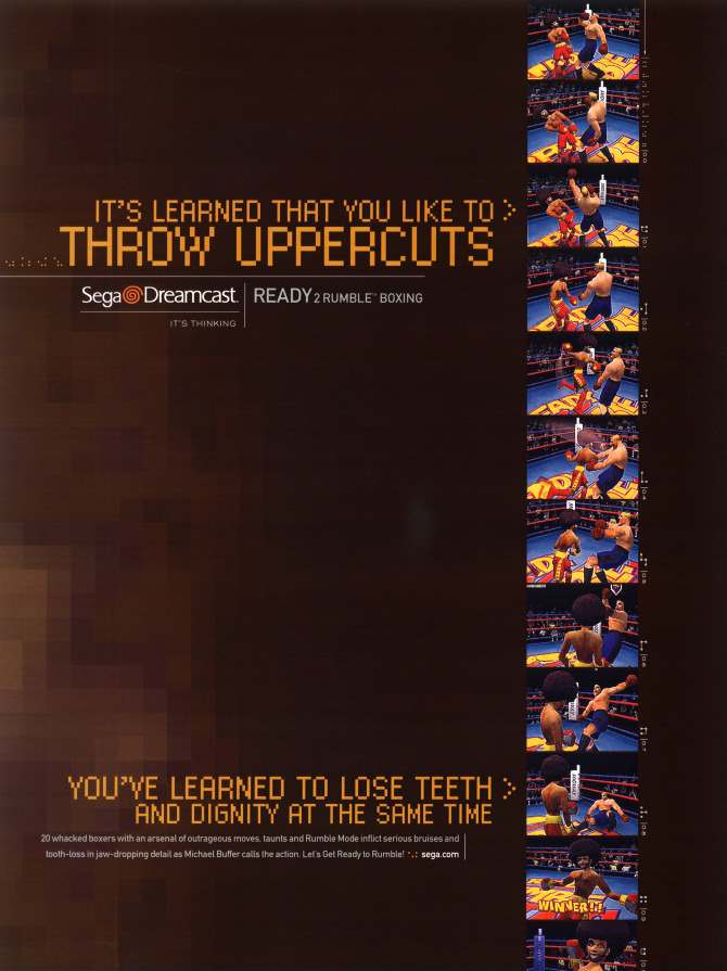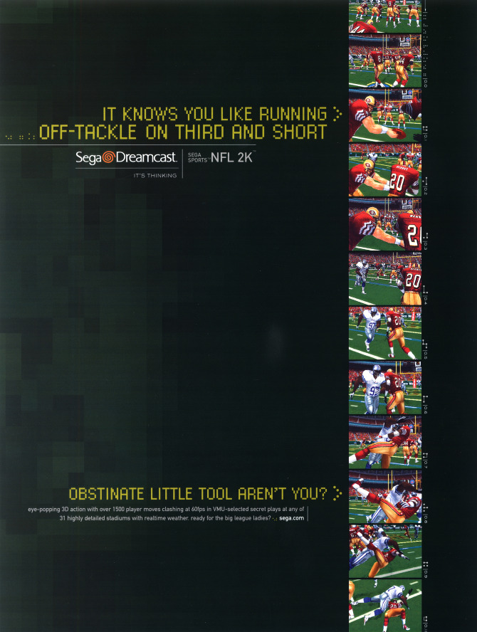 The Sega Dreamcast’s processor allowed it to adapt to gamers’ actions. Thus, the “It’s Thinking” tagline was created and all work centered on bringing characters to life – a massive undertaking that was a lot harder than it looked. The print was designed to display the games great looks but also to show the exact moment when the game got smart and beat you.